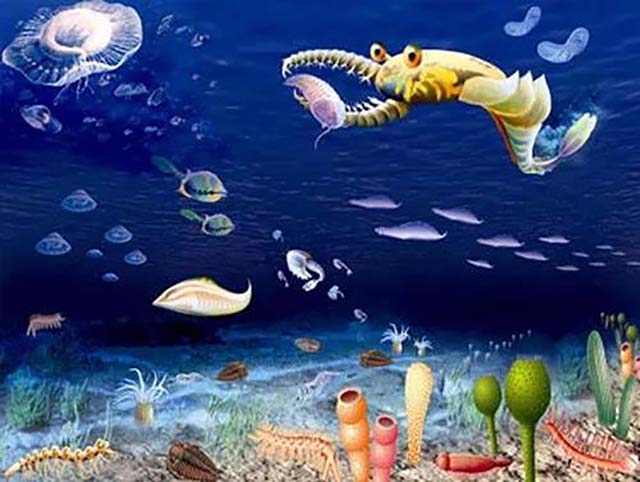 因此,相对于寂静的前寒武纪生命世界,寒武纪海洋生物显得生机盎然,格外热闹。底栖爬行的、底栖固着的、底栖钻埋的、游泳的、漂浮的生物构建了海洋世界多层次的生态分布。生物界从此显得多姿多彩,走上了通向现代生物的演化之路。