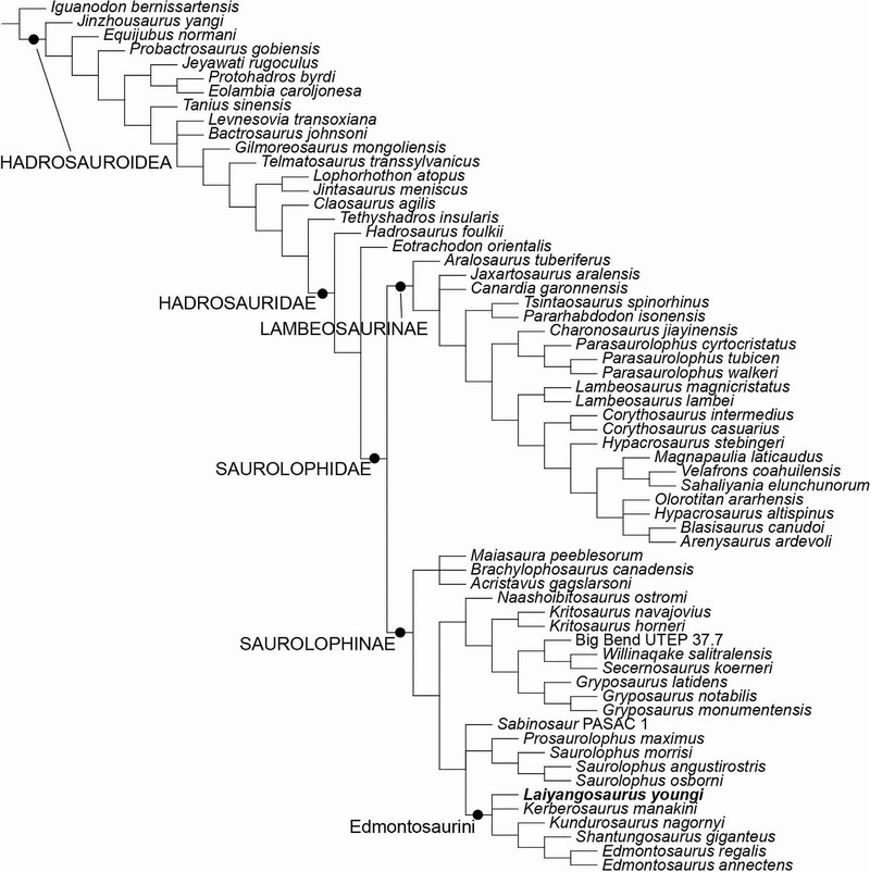 鸭嘴龙超科是一类生活在白垩纪晚期的大型陆生植食性鸟臀目恐龙,种类众多、分布广泛,其最明显的特征为头部扁长并具形似鸭嘴的吻部,以及复杂的齿列和强大的咀嚼系统。鸭嘴龙超科包含较原始的基干类群和较进步的鸭嘴龙科,部分鸭嘴龙科成员具有形态各异的头饰结构,因其头饰形态不同,鸭嘴龙科可分为平头的和具有实心头饰的栉龙亚科,以及具有空心头饰的赖氏龙亚科。莱阳鸭嘴龙动物群的中国谭氏龙属于鸭嘴龙超科基干类群,棘鼻青岛龙属于赖氏龙亚科,而杨氏莱阳龙属于栉龙亚科。